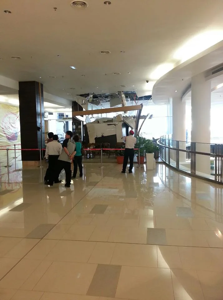 Apparently, an air-con unit collapsed through the ceiling of the Starbucks Coffee outlet. The “wreckage” landed right smack in the area where tables and chairs are laid out. The incident happened during operation hours of the mall and there has been no news yet if anyone was hurt.