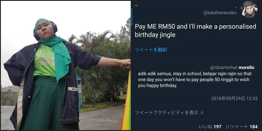 However, Takahara Suiko who is the lead singer of experimental band The Venopian Solitude has decided to use the same approach to make money. But instead of a simple wish, she makes personalised birthday jingle for RM50.