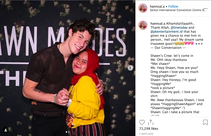 A few Indonesian fans were lucky enough to take part in meet-and-greet session with the singer-songwriter, including one Muslim fan known as Hanna. She took to her Instagram to share her excitement with her followers after meeting Shawn in person.