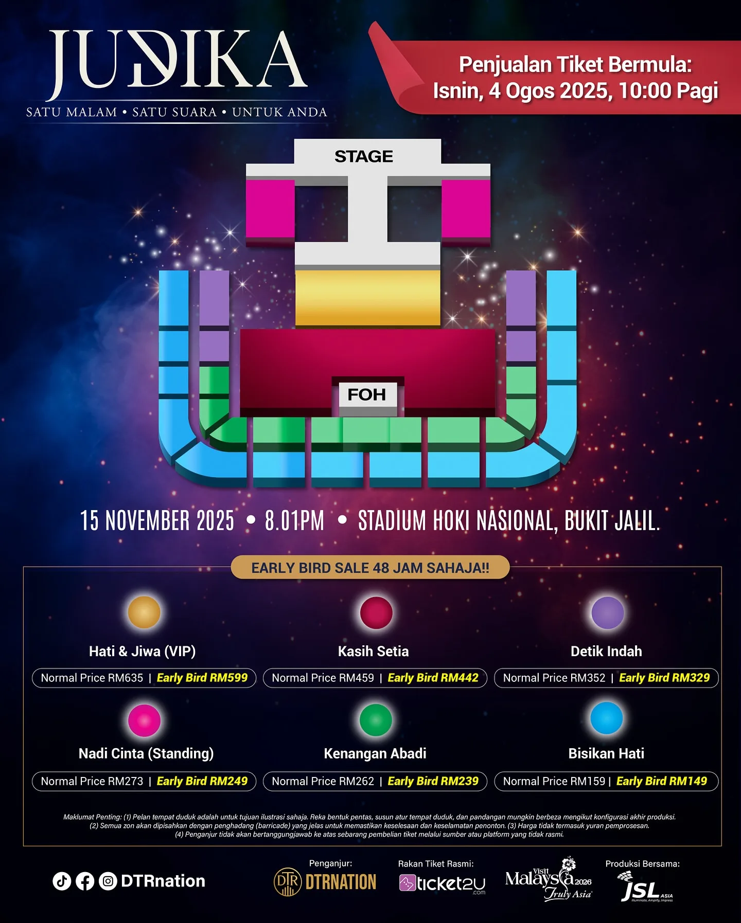 - Ticketing (Normal Price): RM635 (Hati & Jiwa/ VIP), RM459 (Kasih Setia), RM352 (Detik Indah), RM273 (Nandi Cinta/ Standing), RM262 (Kenangan Abadi), RM159 (Bisikan Hati)