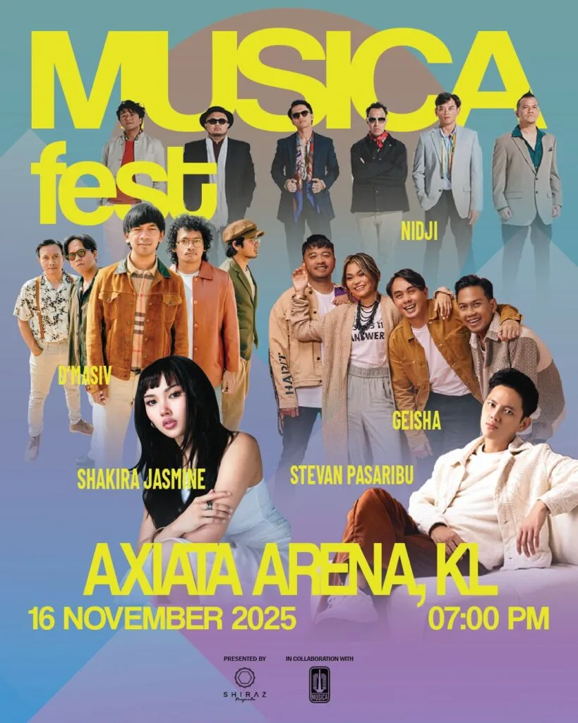 Concert organiser Shiraz Projects is collaborating with Musica Studios Indonesia to bring five Indonesian musical acts to Malaysia. The “Musica Fest” is happening on 16th November 2025 (Sunday) at Axiata Arena. The joint concert will feature renowned Indonesian bands Nidji, Geisha and D’Masiv, and up-and-coming singers Shakira Jasmine and Stevan Pasaribu. Tickets for the show have gone on sale and are now available via myticket.asia.
