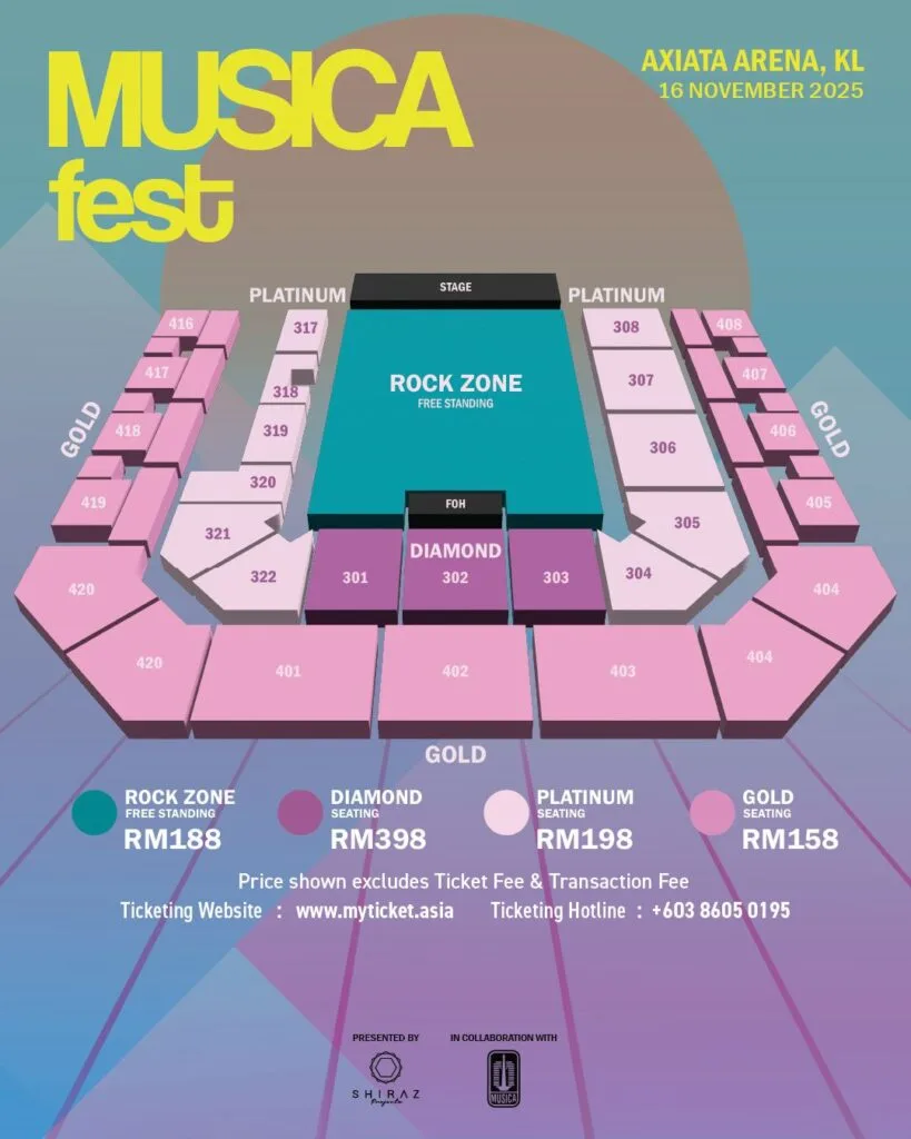 - Ticket Prices: Diamond: RM398, Platinum: RM198, Gold: RM158, Rockzone (Free Standing): RM188