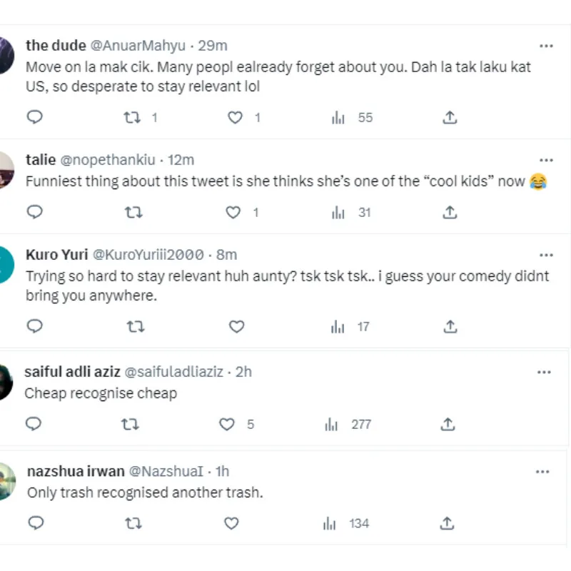 Of course, her tweets were not well-received by Malaysians, but most netizens just shrugged off the comedian’s remarks. One netizen asked for Jocelyn to move on because she’s no longer relevant, and another said this is just another example of “cheap recognising cheap”. Some joked that the funniest part about the comedian’s joke was the statement of her being “one of the cool kids”.