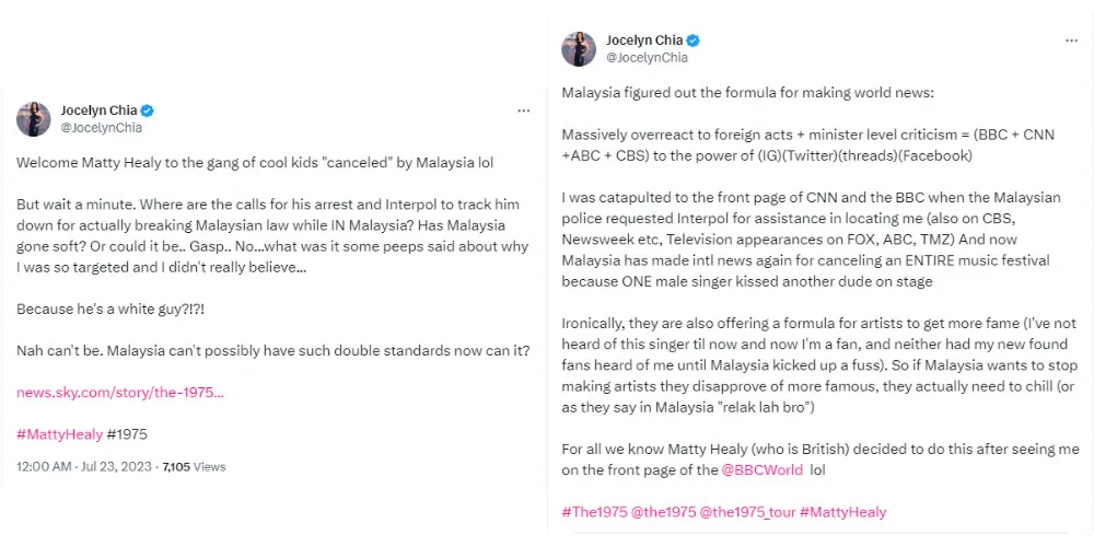 If you don’t remember her, the former Singaporean was previously witchhunted by Malaysians for mocking the MH370 plane crash. After the incident at the music festival, she shared several tweets reacting to the fiasco and mocking Malaysia. In her tweet, the comedian said Malaysia has “figured out the formula for making world news” but added that the formula also gets disgraced artists more fame. Before ending her post, Jocelyn even wondered if Matty was inspired after “seeing me on the front page of BBC“.