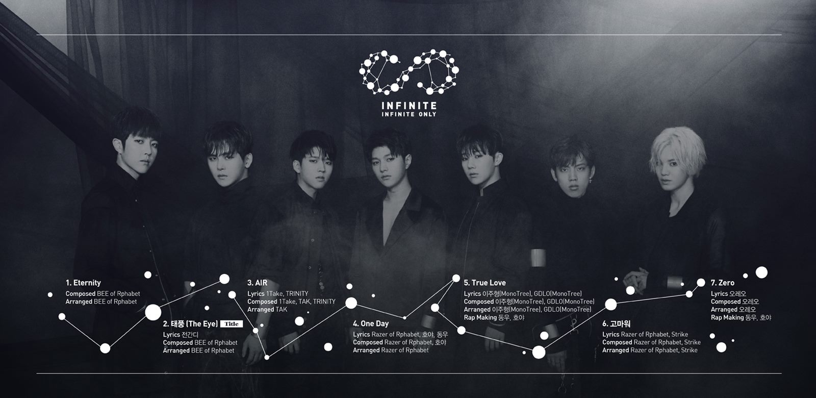 The track list has also revealed that the album will contain a total of 7 songs, with rappers Hoya and Dongwoo participating in the lyrics writing of 2 songs. Track number 2, “The Eye (태풍)” has also been chosen as the title track.