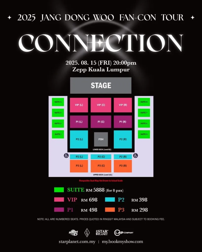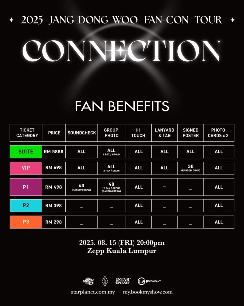 Great news, INSPIRIT! After a long wait, Star Planet and MACH D has unveiled details for Jang Dong Woo’s first solo fan-con in Malaysia! The idol will meet fans at Zepp Kuala Lumpur on 15th August 2025 (Friday). Ticket sales will begin 20th June 2025 (Friday) via BookMyShow Malaysia. Check out the ticket prices, seating plan and fan benefits below: