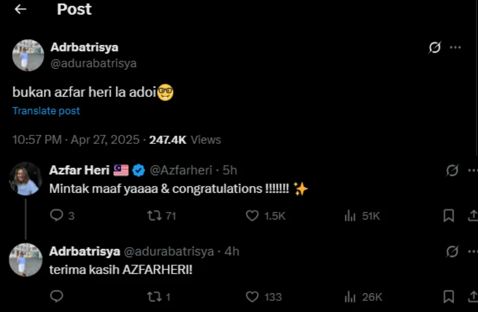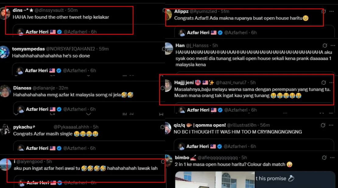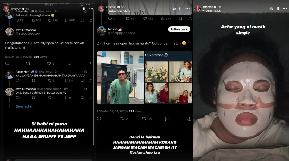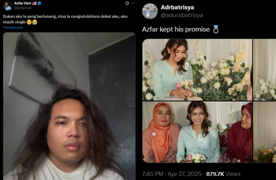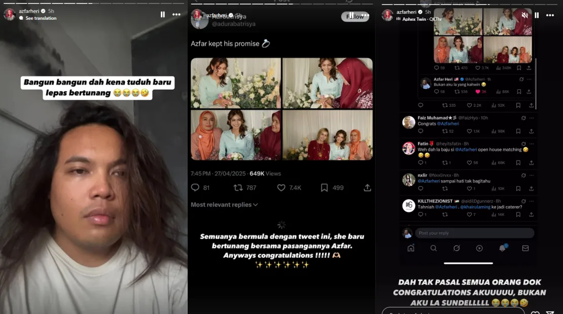 Some could not help but laugh at the hilarious mix-up, while others admitted they had genuinely believed Azfar was getting married. A few continued to send congratulatory messages as a joke, even suggesting that his recent Open House was also a secret engagement ceremony. As for Adura, she did not seem offended by the viral joke, clarifying that Azfar Heri is not her fiancé. The influencer himself even apologised to her and congratulated the bride-to-be on her engagement.
