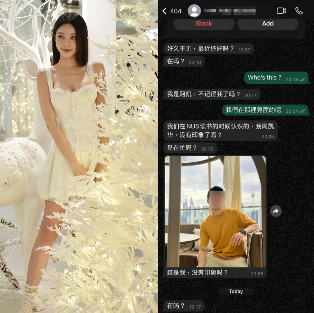The influencer took to Threads on 25th February 2025 (Tuesday) to share her experience. In the now-deleted post, Cathryn shared a screenshot of a WhatsApp conversation between her and the alleged scammer. The individual claimed to be her classmate at the National University of Singapore, even attaching a photo of a young Chinese man to “prove” their identity. However, Cathryn was never a student at the university and quickly picked up on the scam tactic.