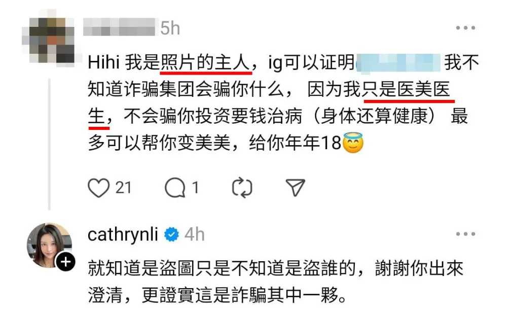 The post prompted many responses from netizens – including from the man in the photo. Since Cathryn didn’t blur out the man’s face, she accidentally exposed his identity. He then left a comment to clarify the matter, saying someone had stolen his photo to commit fraud. He also revealed that he’s a medical aesthetic doctor and would never scam anyone. Cathryn then responded to the man, thanking him for clarifying the issue.