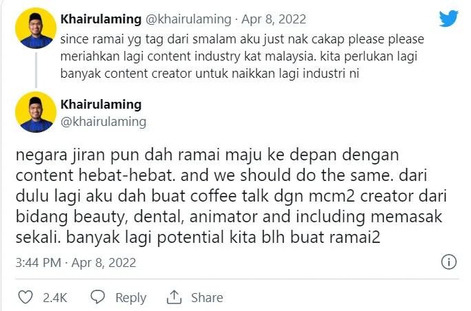 “Since many people tagged my name yesterday, all I can say is, please, please enliven the content industry in Malaysia again. We need more content creators to bring this to the forefront,” Khairulaming (full name Khairul Amin Kamarulzaman) wrote on his Twitter. In the meantime, he also appeared to compare our country to the neighbouring countries that often produces much more spectacular content.