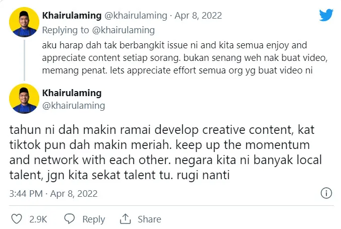 Khairulaming added by writing, “I hope people will not bring this issue up after this, and we can enjoy and appreciate each other’s content. It’s not easy to make a video. It’s tiring. Let’s appreciate the effort of all the people who made these videos. This year, more and more people are developing creative content.”