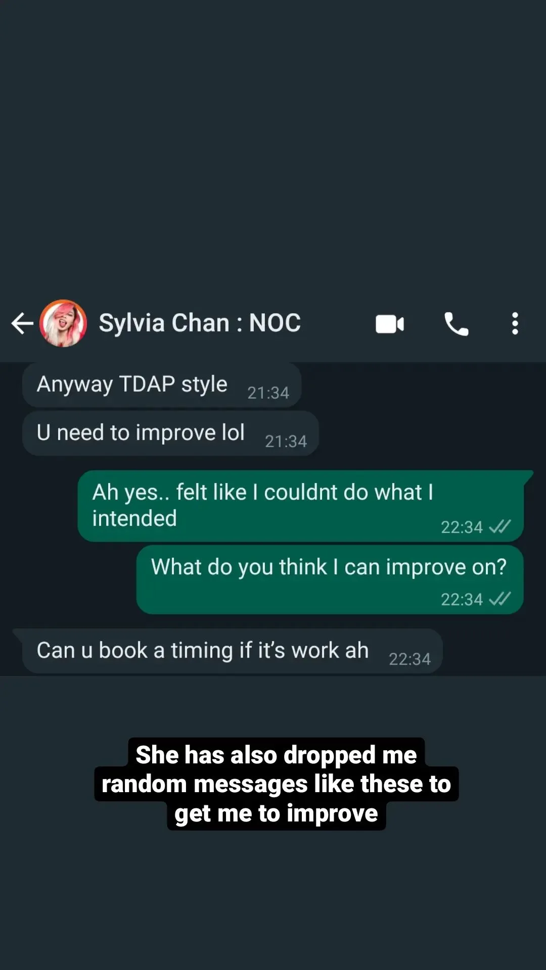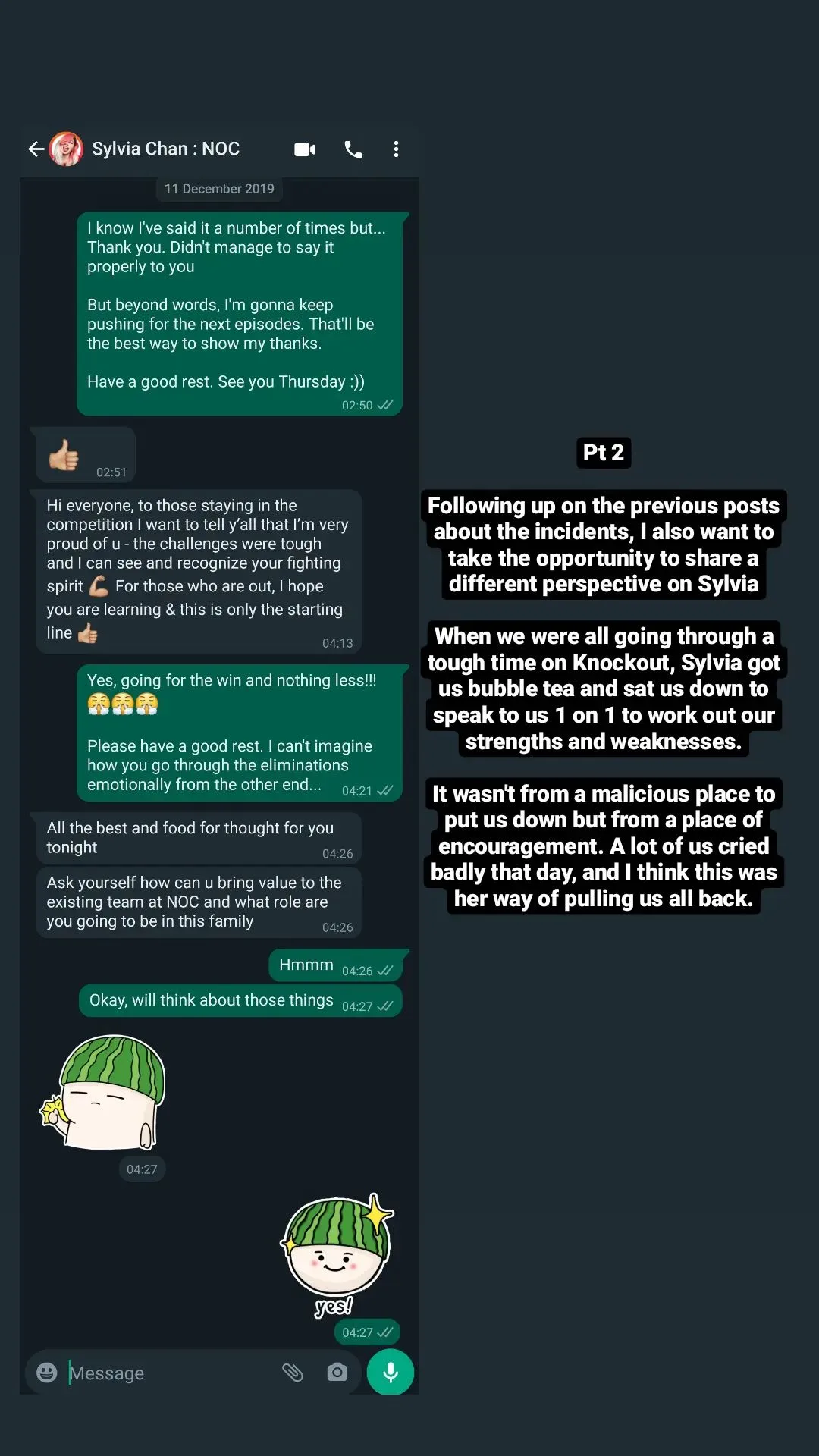 “When we were all going through a tough time on Knockout, Sylvia got us bubble tea and sat us down to speak to us 1 on 1to work out our strengths and weaknesses,” he recalled, by including an old text exchange. “A lot of us cried badly that day, and I think this was her way of pulling us all back.”