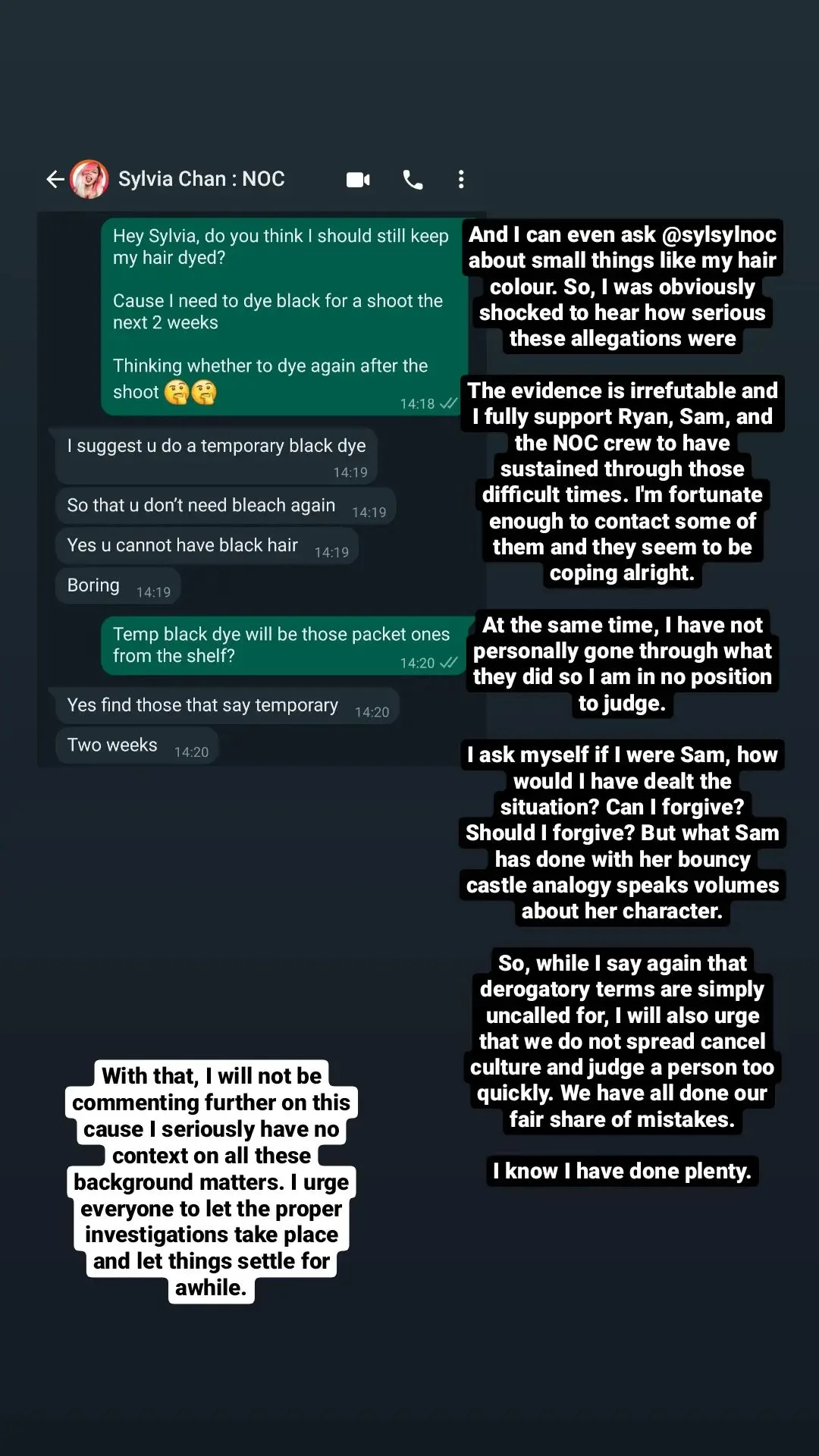Of course, he isn’t negating the abuse and unfair treatment towards so many NOC staff, especially Samantha Tan. Many of the NOC talents and crew have also urged netizens not to target Night Owl Cinematics as a company as the livelihood of everyone working there might be affected. To echo what Ryan said over the weekend, 2 wrongs don’t make a right.