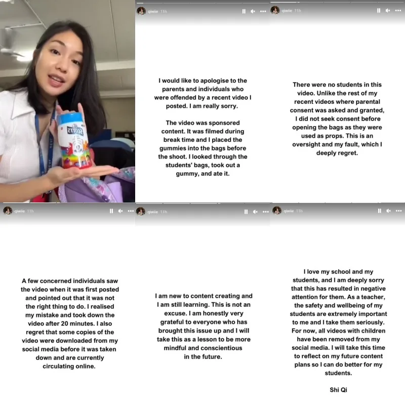 A few days after the controversial video went viral, Shi Qi posted an official apology in a series of photos on her TikTok and Instagram. In her statement, the REAL International School teacher first apologised to everyone who was offended by the post. She then verified speculations that the video was indeed a sponsored post as she was seen taking out items of the same brand from her students’ bags a few times.