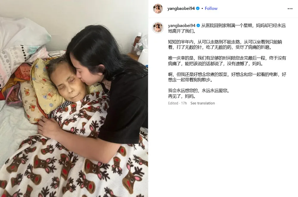 In her captions, Yang Baobei revealed the pain her mother went through since her diagnosis, writing “In just half a year, from being able to walk to being unable to walk, from being able to sit to only being able to lie down, received countless injections, took countless medicines, and suffered from illness.” Despite that, the public figure said she felt blessed that she could accompany her mother during her final days and until she is no longer in pain, adding that she has no regrets.