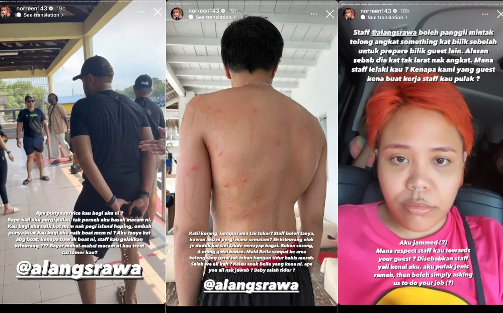Internet personality Norreen Iman was the first of the group to expose the terrible service and living conditions of Alang’s Rawa, a private boutique island resort located on Rawa Island in Mersing, Johor. In a string of Instagram Stories, the influencer spoke about the terrible experience she and the other guests had endured while staying at the resort.