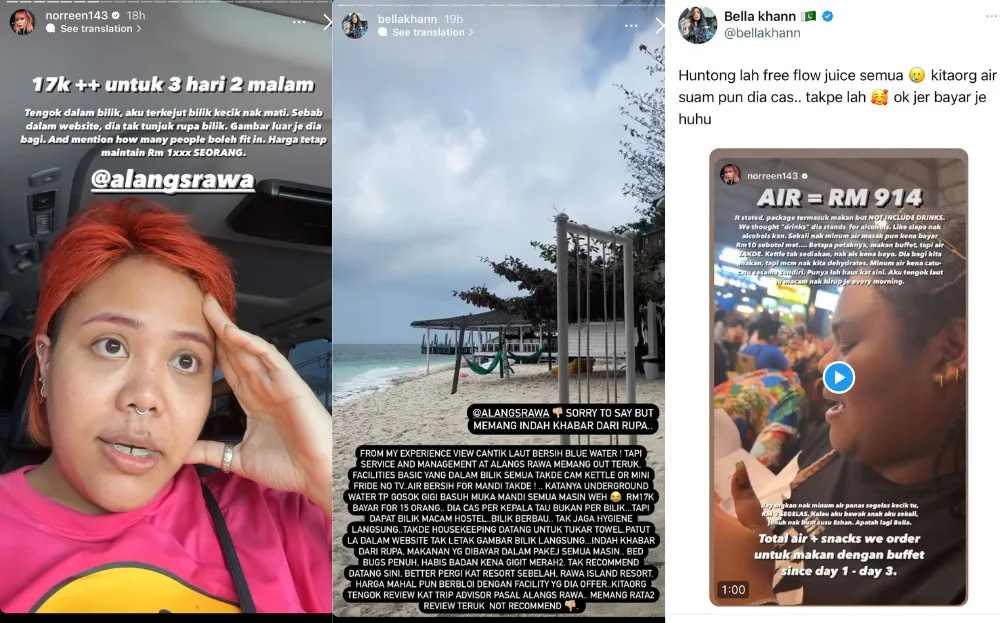 Entrepreneur Bella Khann was another guest from the same group who also complained about the resort. In her Instagram Stories, the public figure spoke about the water supply, saying that the group had to brush their teeth with salty water. She also shared the absurd prices for their meals, adding that the group had to pay over RM900 just for drinks and snacks.