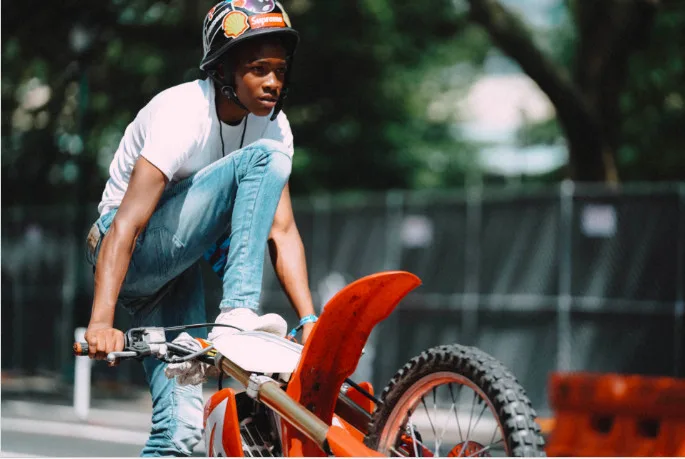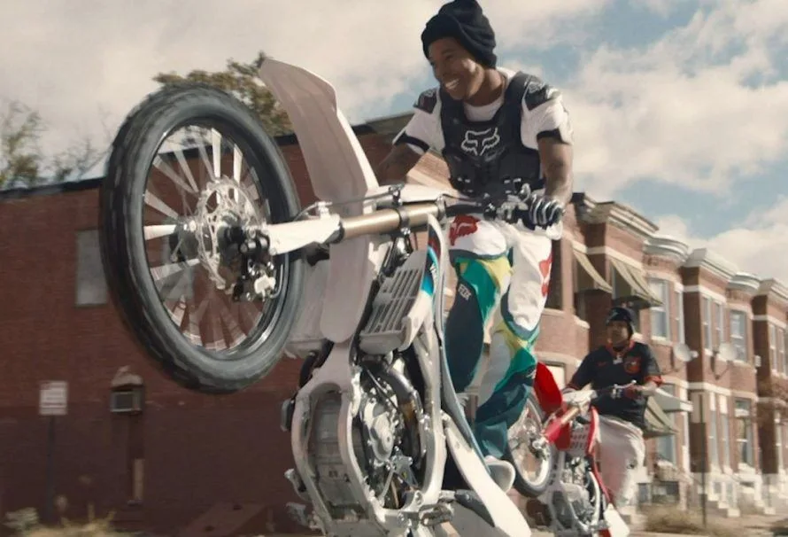A: Our source of reference for the film was the “12 O’Clock Boys” documentary by Lofty Nathan. I watched it a lot of times to get accustomed to the dialect and the eccentricities of the people who live in Baltimore. And the more I did that, the better I was able to allow myself to get fully immersed into the culture of the city and its dirt-bike community. Also, us being in Baltimore every single day filming the movie was incredible. It was my first time there and it didn’t disappoint. For me, as an actor, and as an artist, I had a lot of fun being amongst the everyday Baltimore citizens, and it helped enhance my performance, for sure.