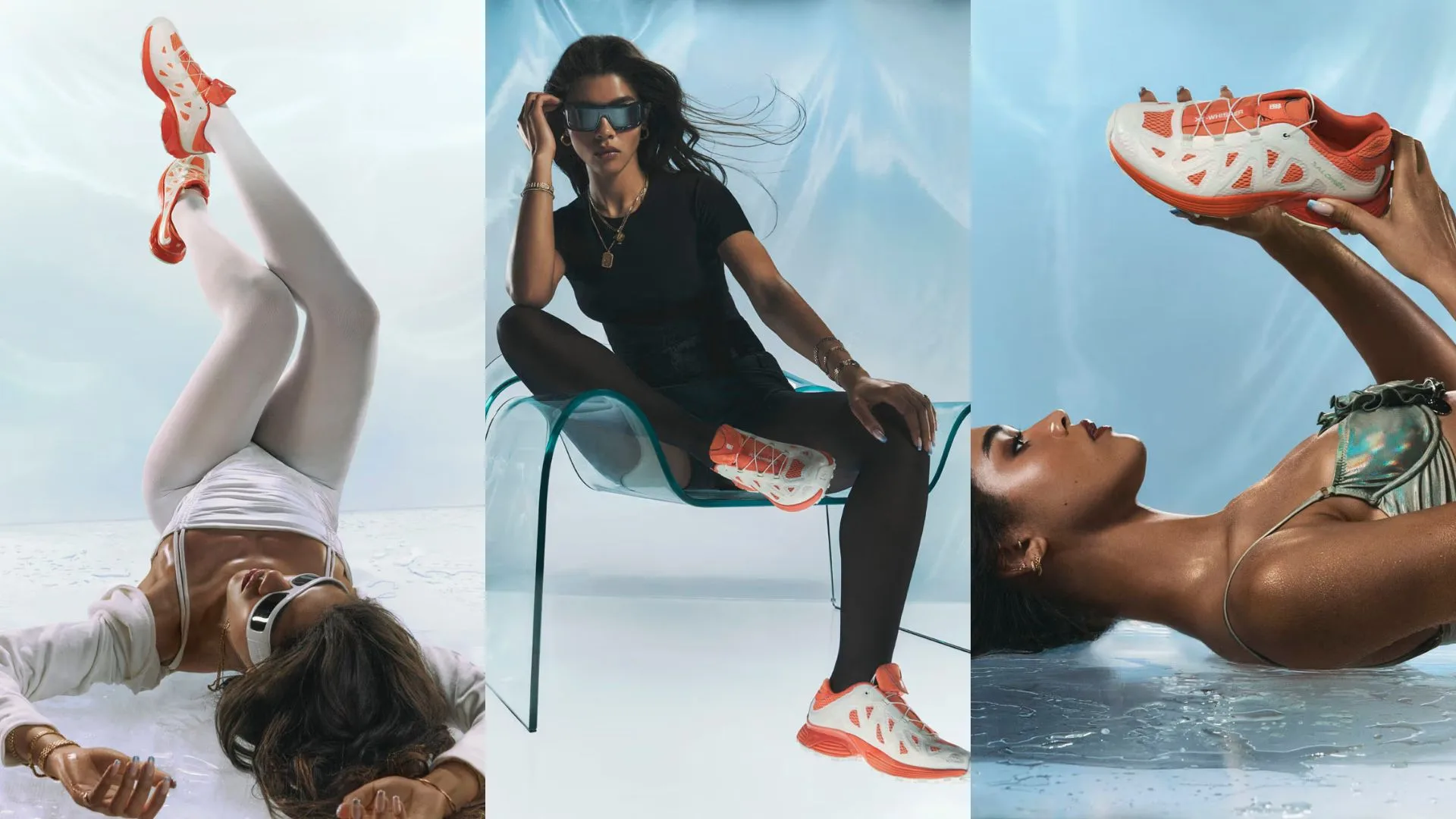 Its vibrant “Prism” style complements the clothing by fusing white with a range of hues and acknowledging the two through co-branding.