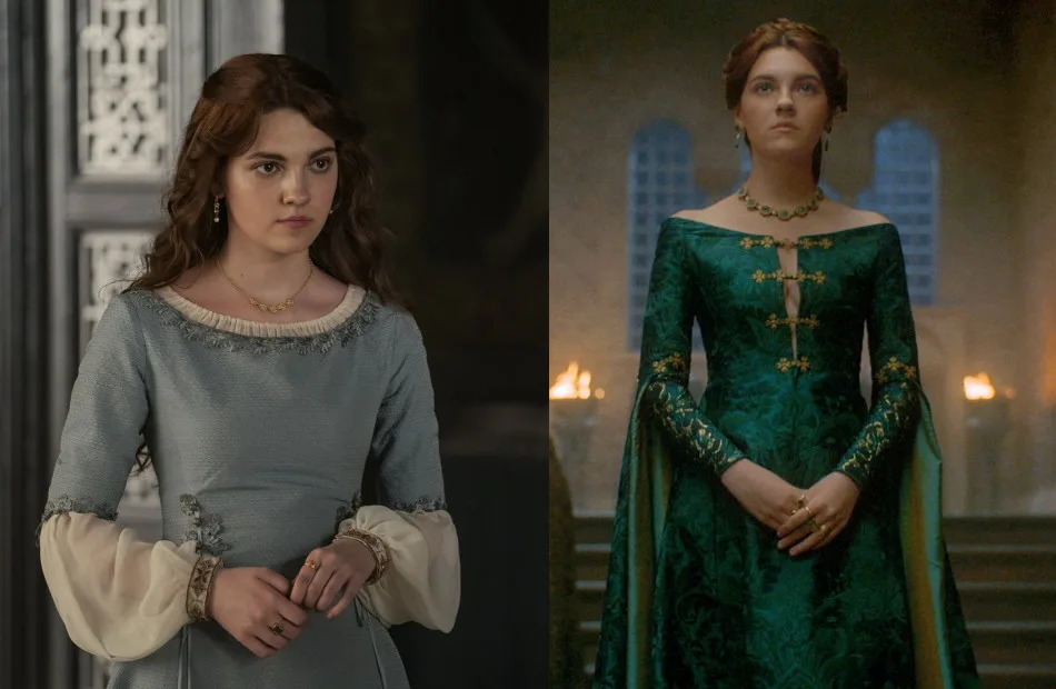 As I said, she’s very aware of her place in the world. She’s very aware of who she is, why she’s there, what she should be doing. Rhaenyra is also aware, but doesn’t enjoy it as much. When we meet the girls, they are close in age, in character, in upbringing, but there are moments when you see that sort of power-dynamic shift. It goes on to change dramatically throughout the entirety of the show and so it’s interesting seeing it at the very beginning when Rhaenyra has that edge on Alicent. A lot of that is shown through who obliges more to the rules of being a young girl in this society.