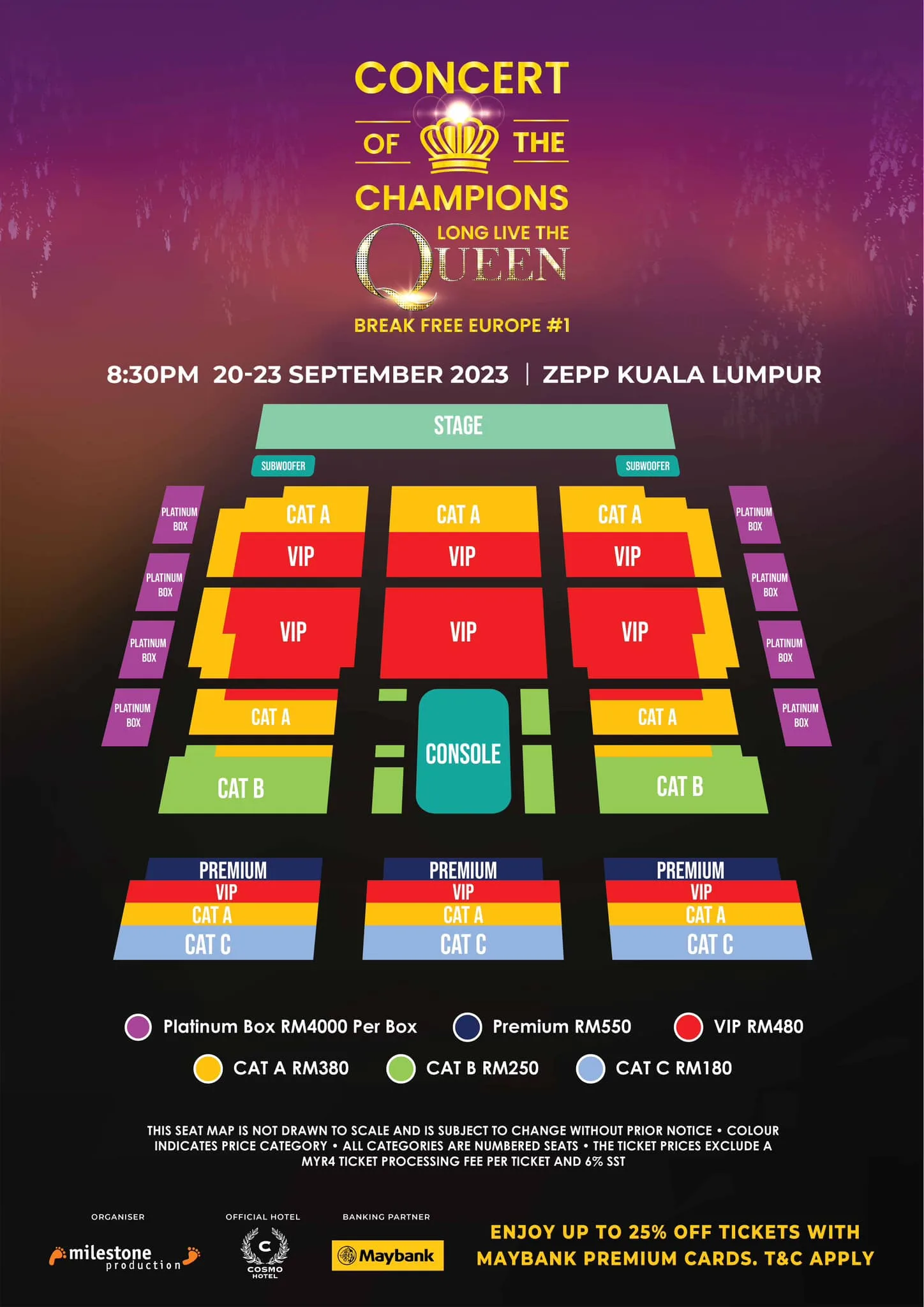 - Ticketing: PREMIUM RM550, VIP RM480, CAT A RM380, CAT B RM250, CAT C RM180