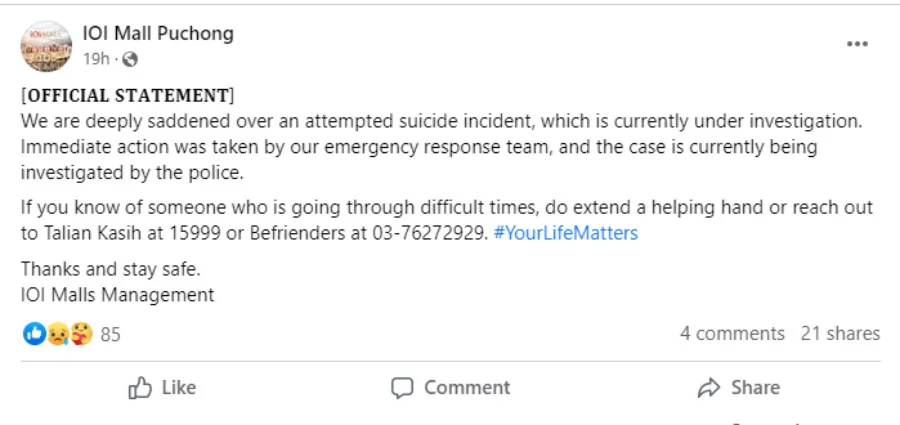 Later that afternoon, IOI Mall Puchong released an official statement on its Facebook page to confirm the suicide attempt incident. “We are deeply saddened over an attempted suicide incident, which is currently under investigation. Immediate action was taken by our emergency response team, and the case is currently being investigated by the police,” the management wrote.
