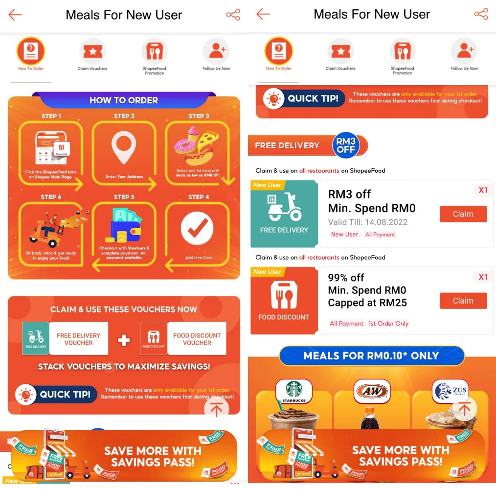 Now if you noticed, on the ShopeeFood main page you might’ve caught a glimpse of the ‘up to RM10 OFF’ , ‘Free Delivery’ , and ‘New User Voucher’ icons. CLICK ON THEM!!! This is where you can find discount vouchers, free delivery vouchers and if it’s your first time using ShopeeFood you get to enjoy free delivery plus RM7 off!