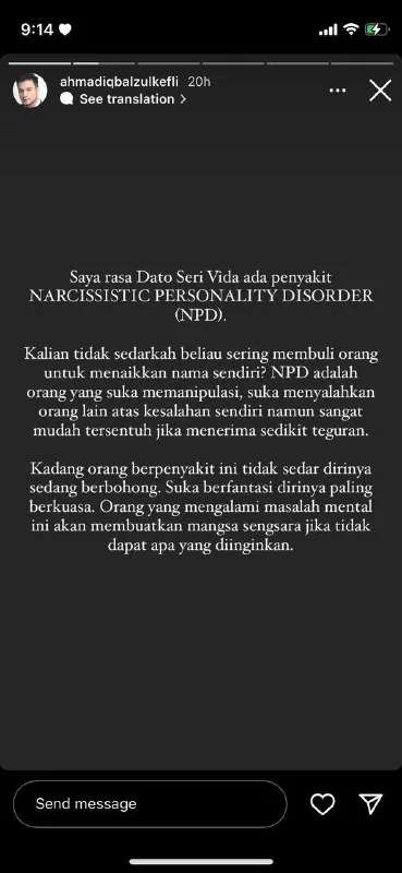 He might’ve been inclined to post his theory after the Anuar Zain issue. The 27-year-old “Hujan” singer stated in his Instagram story, “I think Dato Seri Vida suffers from Narcissistic Personality Disorder (NPD). Can’t you see that she often bullies people to make herself look good?”