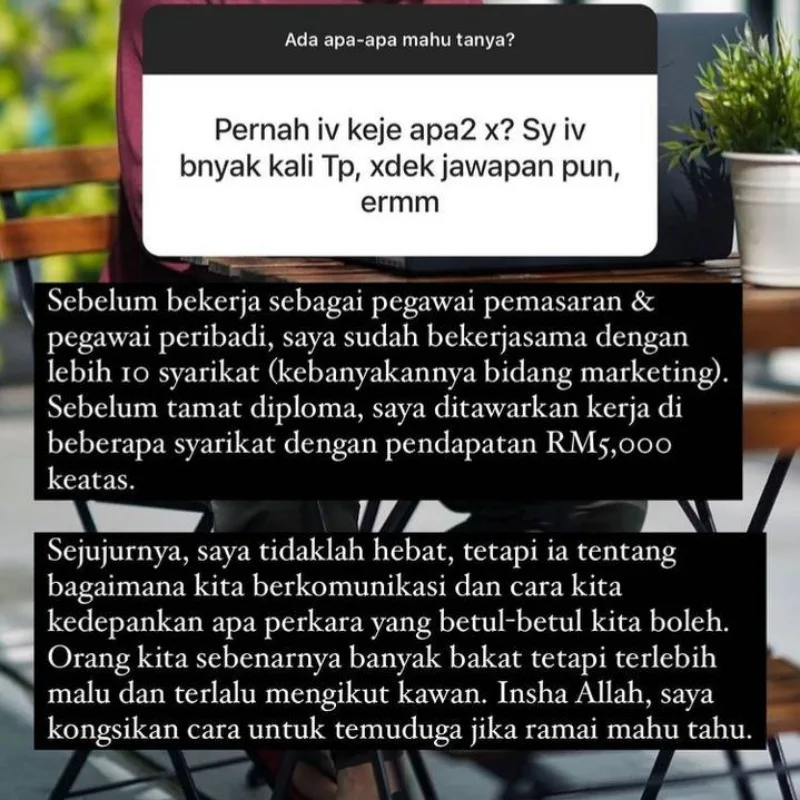 The netizen asked the 27-year-old about his first job interview experiences and if he has any advice he could give to his followers. “Before working as a marketing officer, I’ve worked with 10 companies (mostly in the marketing field). Before finishing my Diploma, I was already offered jobs at these companies with over RM5k worth of salary,” he answered.