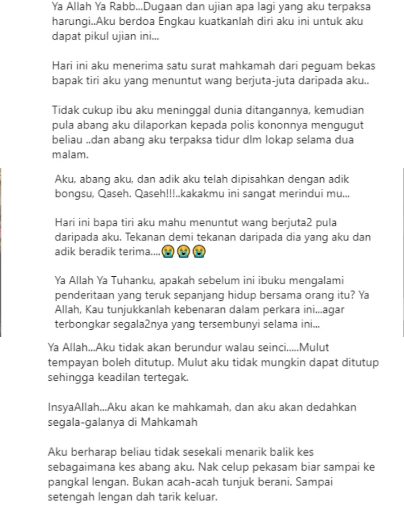 Distraught by the content, the 19-year-old shared the nightmare her family has been experiencing since her stepfather came into the picture. Apparently, she and her brothers suspected foul play in the mother’s death and filed a police report for further investigation. Things took turn for the worse when her older brother was locked up behind bars for 2 nights after allegedly accusing and threatening their then-stepfather.