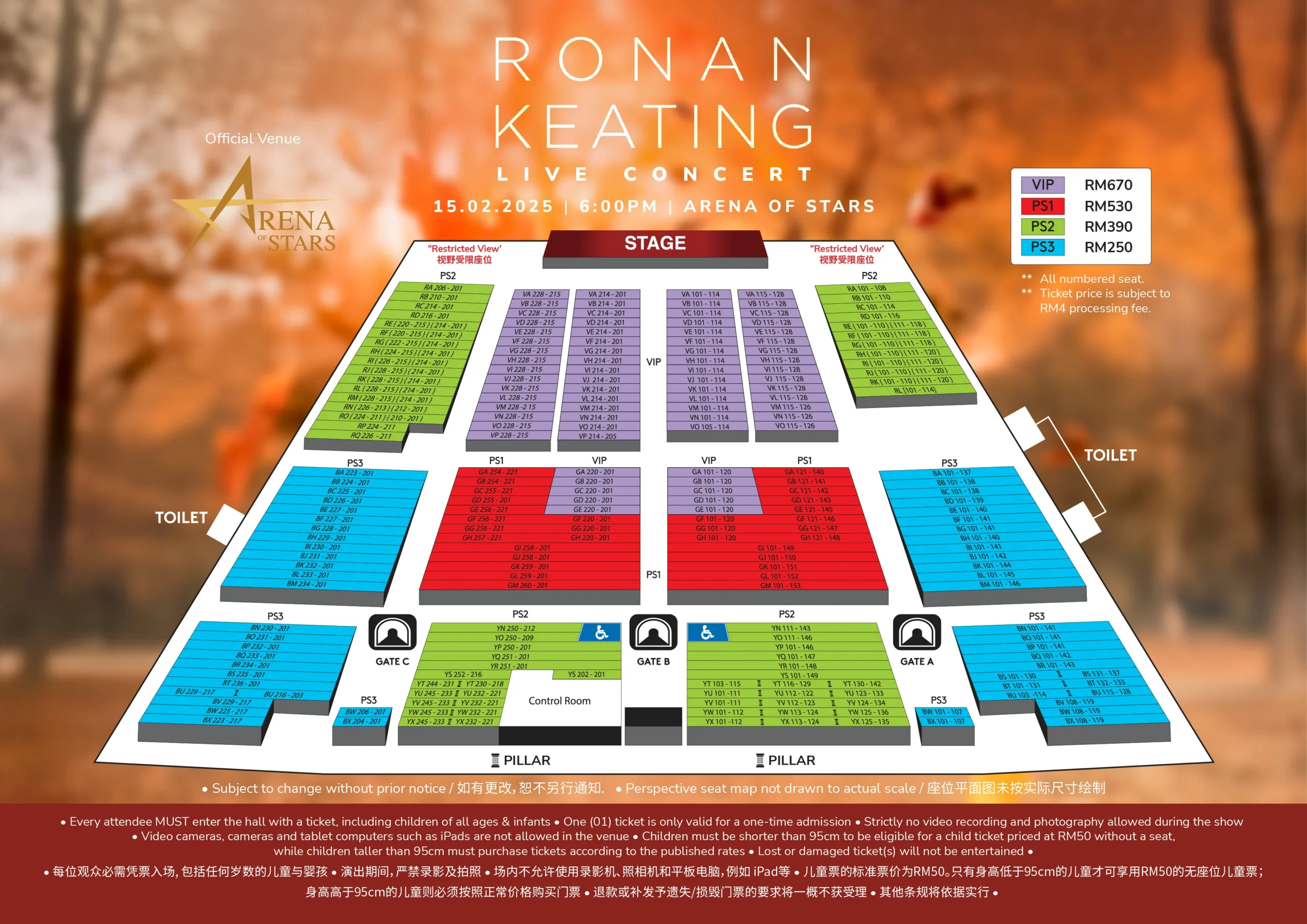 Ronan will be performing live at Arena of Stars, Resorts World Genting on 15th February 2025 (Saturday). Seating plans and ticket prices have already been revealed, with a pre-sale exclusively for Genting Rewards members beginning on 6th November 2024 (Wednesday), and general sales starting on 11th November 2024 (Monday).