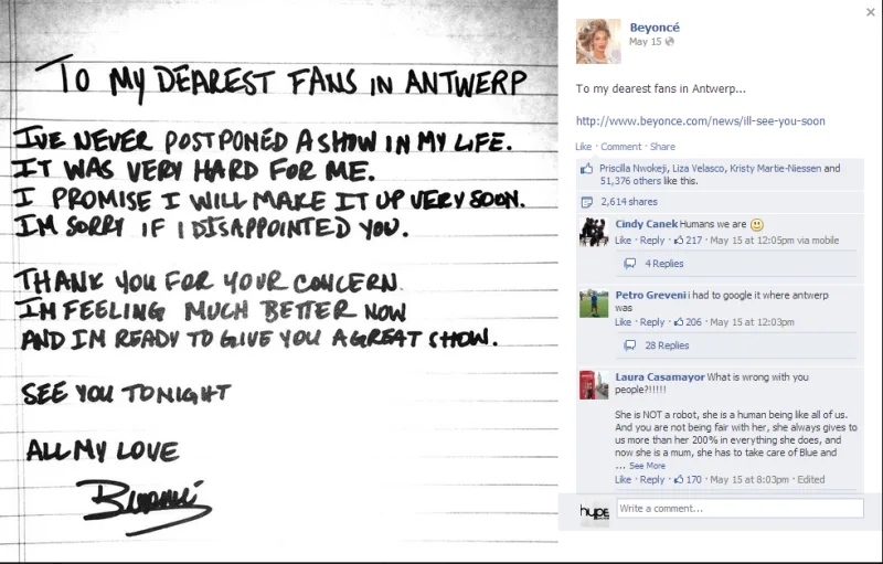 Pregnancy rumors reached an all-time high last week when the 31-year-old “Love On Top” singer canceled a concert in Belgium because of dehydration and exhaustion. The next day, she posted a handwritten apology on Facebook which said:
