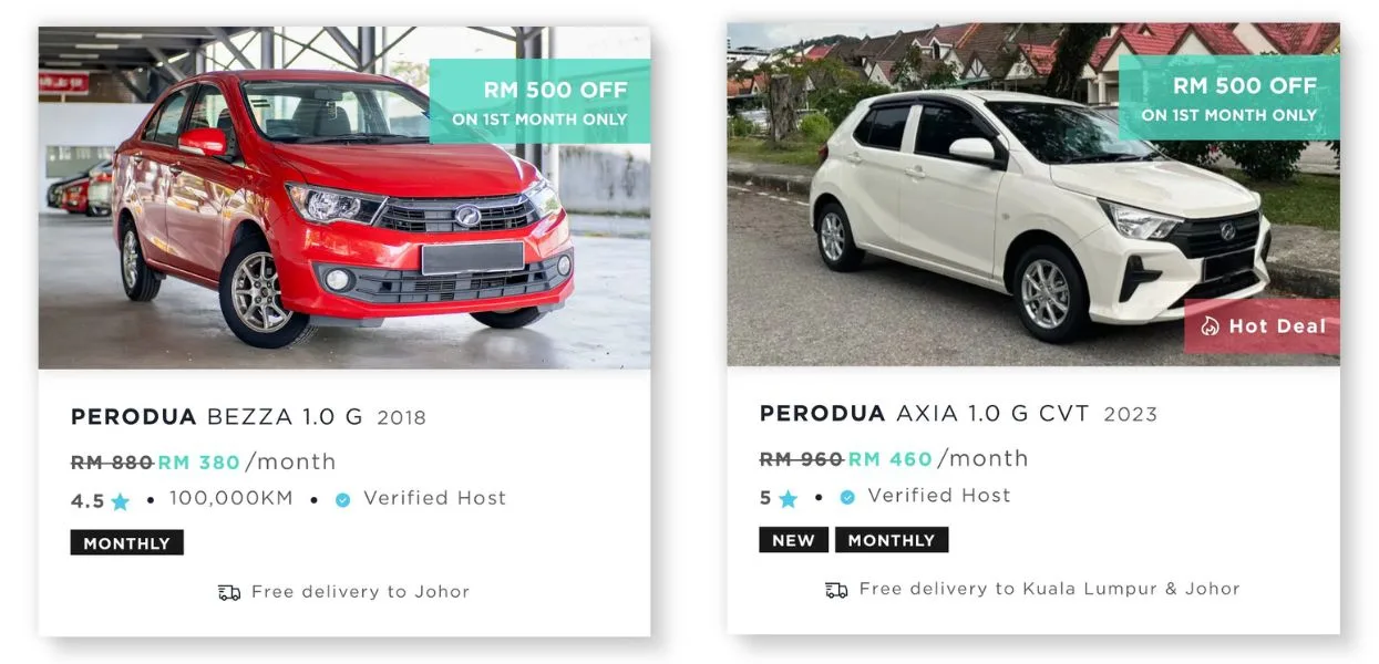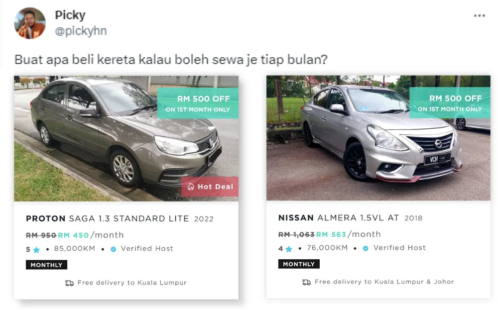 A Twitter user named Picky recently shared a listing for what looked like a car rental service. The listing shows that customers can rent different cars for around RM400 to RM600 per month, which is considerably cheaper than the average monthly car repayment. The rides are also around 1 to 6 years old, with the “newest” being a 2023 Perodua Axia. In his post, Picky also wrote, “Why would you buy a car if you can rent one every month?”.