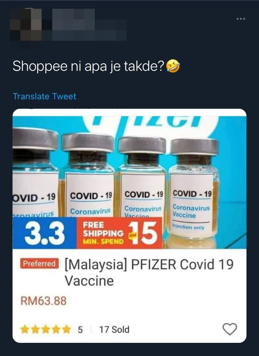 “What is it that’s not available on Shopee?”, one Twitter user sarcastically commented, accompanied with a screenshot of the item on sale. To our surprise, the screenshot showed that up to 17 bottles of vaccines – which was priced at RM63.88 each – had already been sold on the platform!