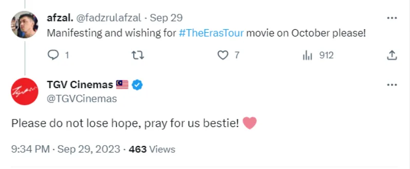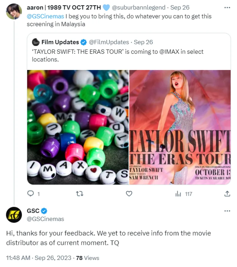 However, there may still be hope for local Swifties as both TGV Cinemas and Golden Screen Cinemas (GSC) have shared that they are still pending updates from distributors. According to a spokesperson for TGV, screening for the movie will depend on which distributor possesses the theatrical right for the film. They added that screening will not be possible unless the distributor has made an offer to them to screen the movie.