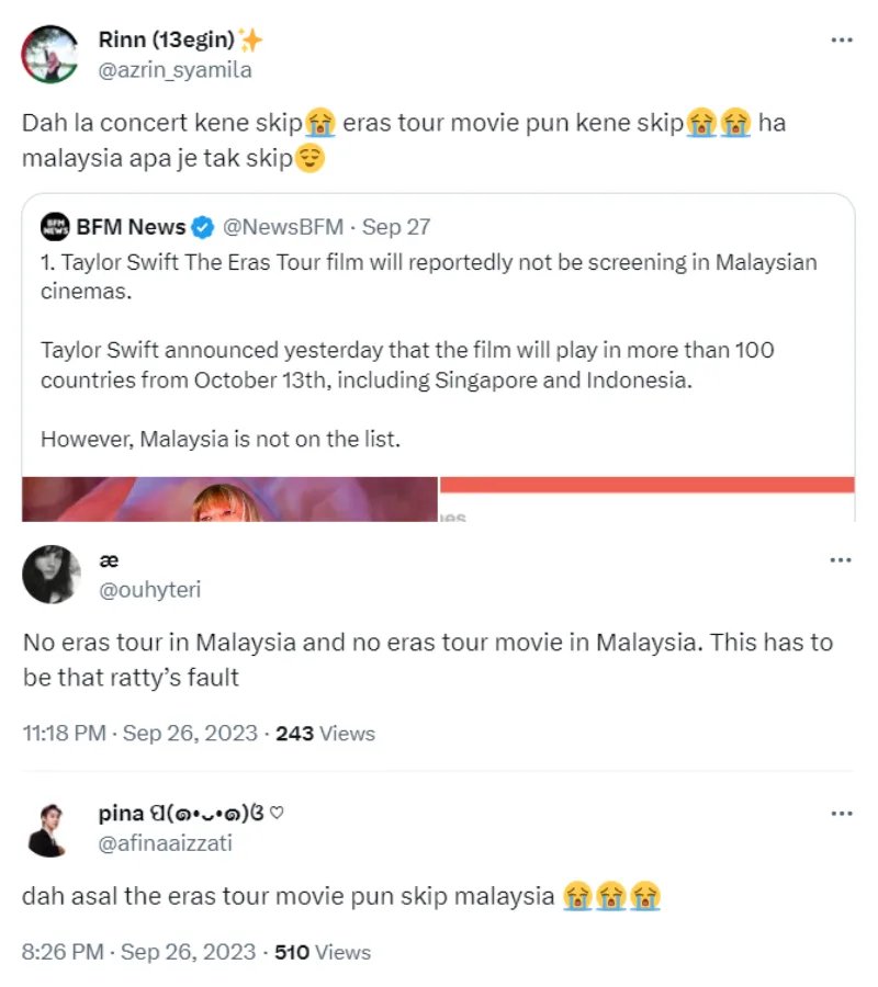 Since American singer Taylor Swift did not include Malaysia as part of her “The Eras Tour”, Malaysians were hoping they could still catch the tour concert film. However, much to their dismay, the film will not be screened locally – but there is still some hope.