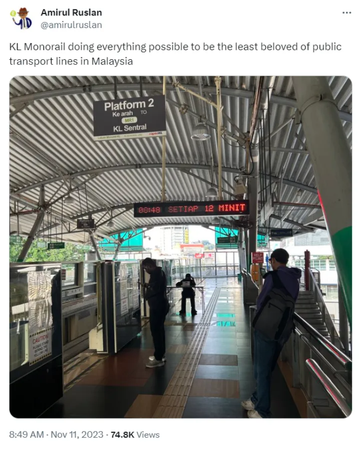 In a tweet by Amirul Ruslan, the Malaysian lamented the KL Monorail system, saying, “KL Monorail (is) doing everything possible to be the least beloved of public transport lines in Malaysia.” The Twitter user also included an image taken at one of the monorail stations, focusing on the 12-minute waiting time for the next train.