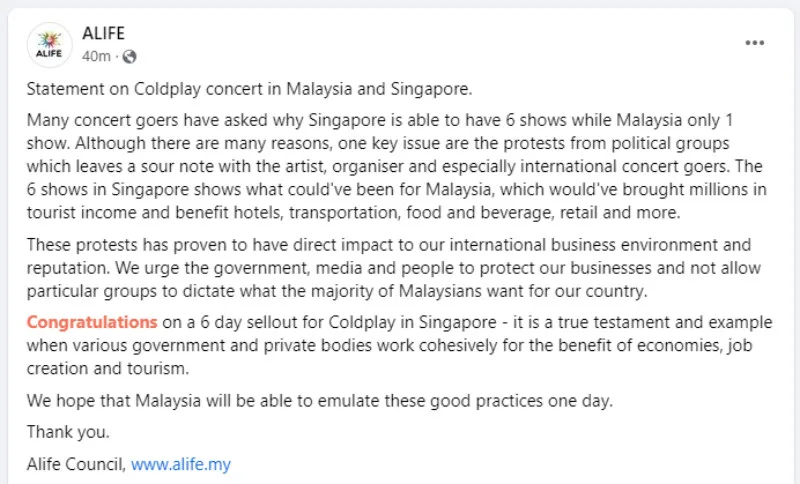 The Arts, Live Festival and Events Association (ALIFE) suggested the reason Malaysia is not getting a second show is probably due to the protests by certain political/religious groups. This has no doubt left “a sour note with the artist, organiser, and especially international concertgoers”, as seen in the screenshot below.