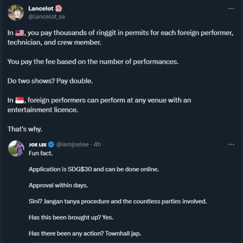 The fee must be paid based on the number of performances and in order to do two shows, they’d have to obviously, pay double the amount. Whereas in Singapore, foreign performers can perform at any venue with an entertainment license. Simply put, it’s cheaper to do more shows in Singapore compared to Malaysia.