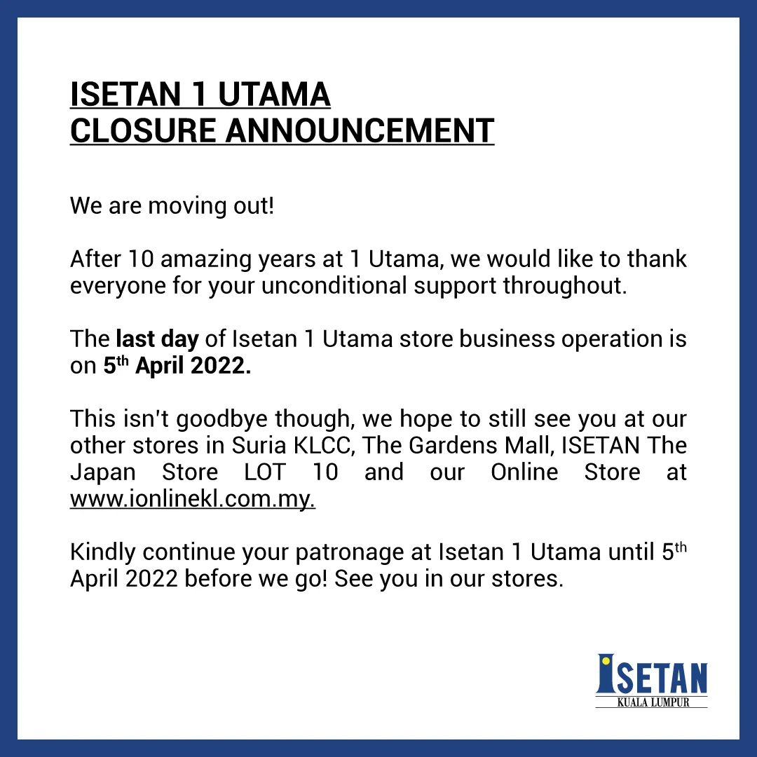 In its statement, the leading Japanese retailing franchise stated that Isetan 1 Utama will officially cease operations in April 2022. While this is unfortunate, at least Isetan is giving its customers an early notice.