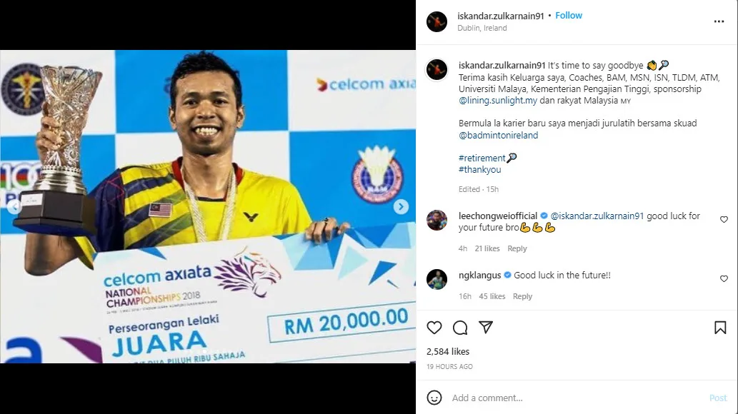 The 30-year-old broke the news on his socials late at night. He shared that it was time to say goodbye and thanked those who had supported him throughout his badminton journey. Among those mentioned were his family, coaches, sponsor and fans. Additionally, he paid homage to groups such as the Badminton Association Malaysia (BAM), the National Sports Council and the National Sports Academy, the Royal Navy, Armed Forces, the University of Malaya and the Ministry of Higher Education.