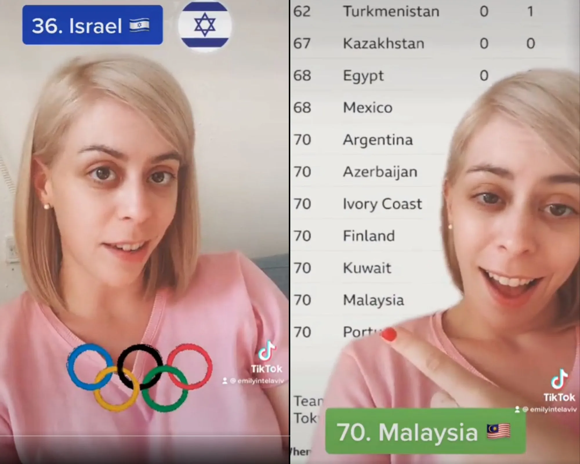Recently, a citizen of Israel, Emily Schrader released a TikTok video on Twitter mocking Malaysia’s ranking in the Tokyo 2020 Olympics. From the video, it could be shown that she’s comparing her country, which is at the 36th position after winning 1 gold and 2 bronze medals to our country which has so far won 1 bronze and is now in the 70th rank.