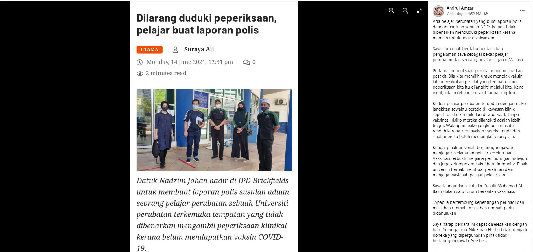 The Chief Activist from the Malaysian Muslim Consumers Association (PPIM), Datuk Nadzim Johan accompanied her to lodge the report. He urged the police to investigate the matter thoroughly, saying that the university should not force its students. “(She) is a medical student and she understands the pros and cons of the vaccine,” he said, referring to Nik Farah. “Thus, when she rejected the vaccine, she understood her risks.” Nadzim sounded disappointed with the university’s actions. He suggested they educate and explain the situation amicably to their students instead. “She has a future,” he stated. “And she can contribute to the country in the future.”