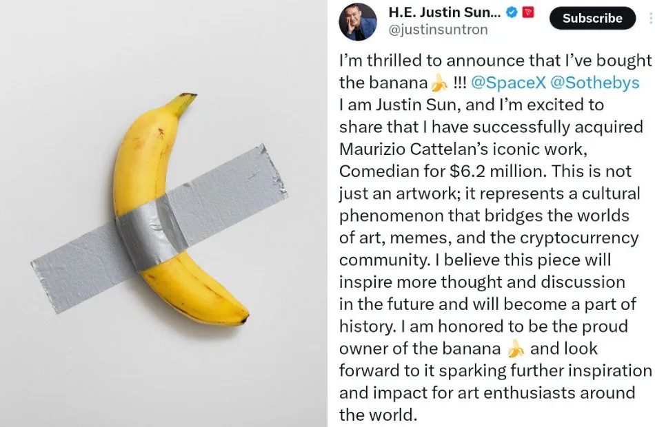 On 20th November 2024, an artwork was sold for $6.24 million (RM278,678,40) to Justin Sun, a former permanent representative of Grenada, at Sotheby’s New York auction. This particular piece, created by the renowned Italian artist Maurizio Cattelan, features a banana attached to a wall using duct tape, positioned precisely 160 cm from the floor. The artwork, titled “Comedian,” first debuted in 2019 as part of an edition of three fruits at the Art Basel Miami Beach fair, where it became a global sensation.