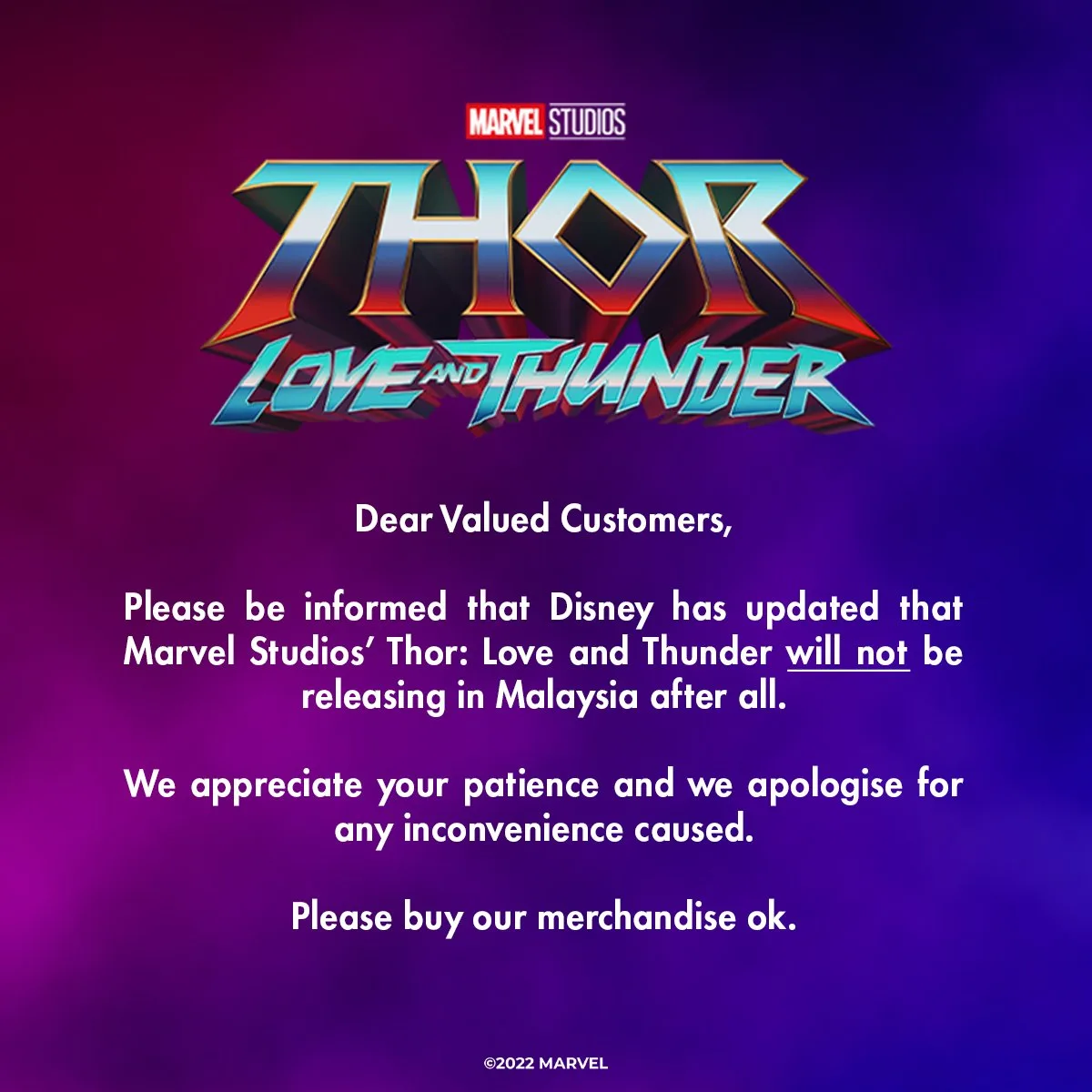 Golden Screen Cinemas (GSC) just shared the news today (28th July) on their official Twitter page that “Thor: Love and Thunder” will not be screening in Malaysian cinemas. “Please be informed that Disney had updated that Marvel Studio’s Thor: Love and Thunder will not be releasing in Malaysia after all,” the statement reads.