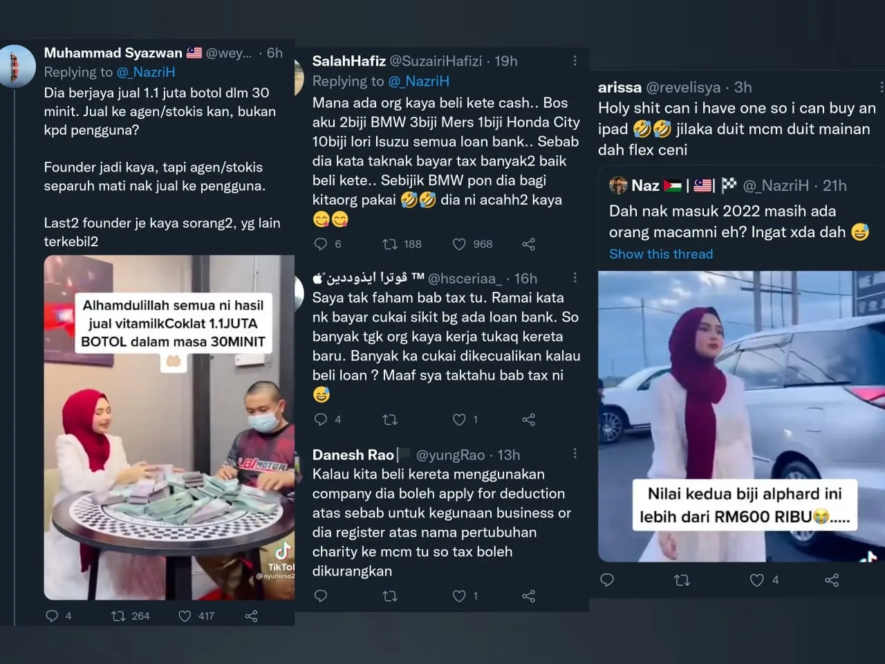 Due to the viral video, netizens began digging around the 18-year-old product founder’s past videos especially on her main TikTok account. It seems like a common occurrence for the young couple to show off their wealth with their spontaneous car purchase. Netizens made another shocking discovery when the founder once bought two luxurious Toyota Alphard cars in cash in a video that resurfaced and circulated on Twitter.
