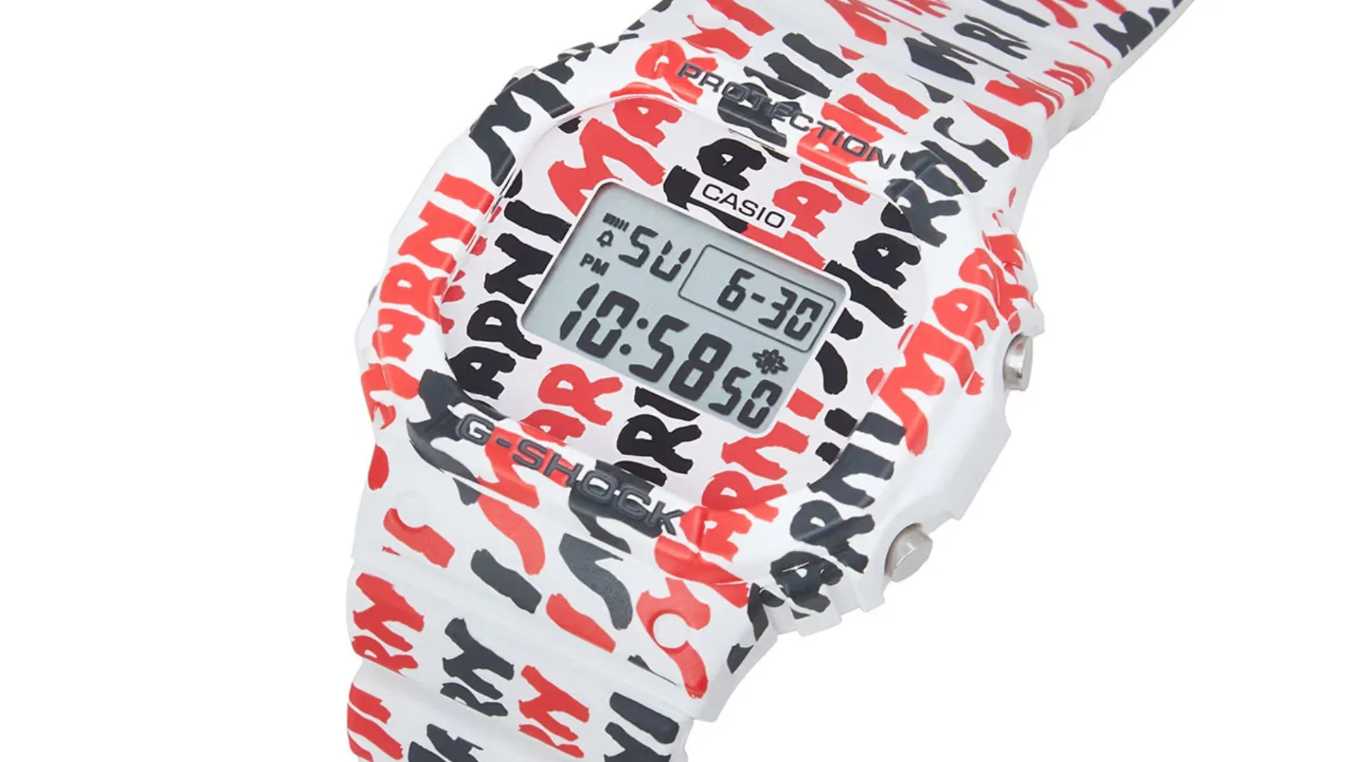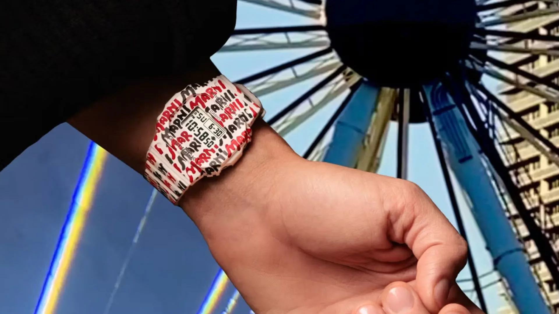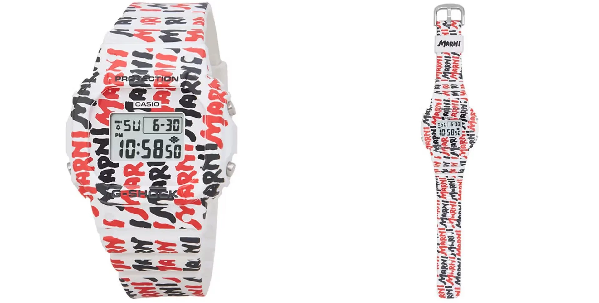 The new GMD-S5610MA-7ER takes the G-SHOCK watch you know and love and gives it that Italian flare. The entire watch silhouette is covered from end-to-end with the word Marni, alternating between red and black on a white back drop.