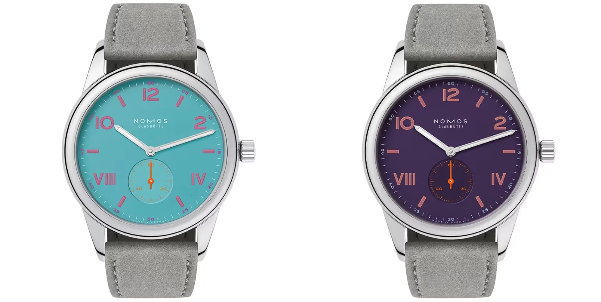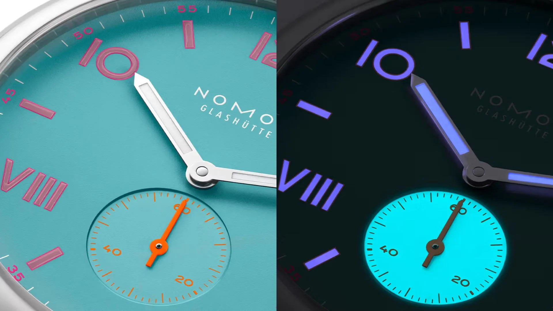As the name states, the “Neon Day” variant features a turquoise dial, while its “Neon Night” counterpart boasts a deep violet hue. Despite their differences, both watches feature rosy fuchsia indices.