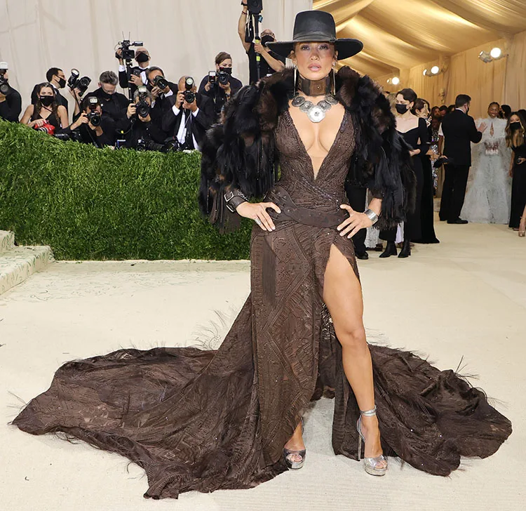 JLo’s version of the “In America” theme for the 2021 Met Gala topped the charts as her second entry in the cowgirl category. Her plunging Ralph Lauren ensemble included a fur cloak for the warm interiors of the Metropolitan Museum, a waist that was deceptively tight, and a sky-high split. JLo couldn’t help but jazz it all up with her distinctive platform shoes, colourful accessories, and a tattered cowboy hat.