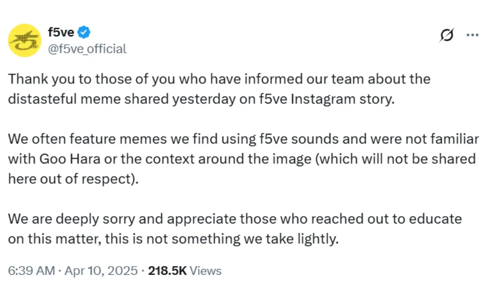 Following the backlash, f5ve quickly removed the image from their Instagram Stories and issued an apology. The statement reads, “Thank you to those of you who have informed our team about the distasteful meme shared yesterday on f5ve Instagram story. We often feature memes we find using f5ve sounds and were not familiar with Goo Hara or the context around the image (which will not be shared here out of respect).”